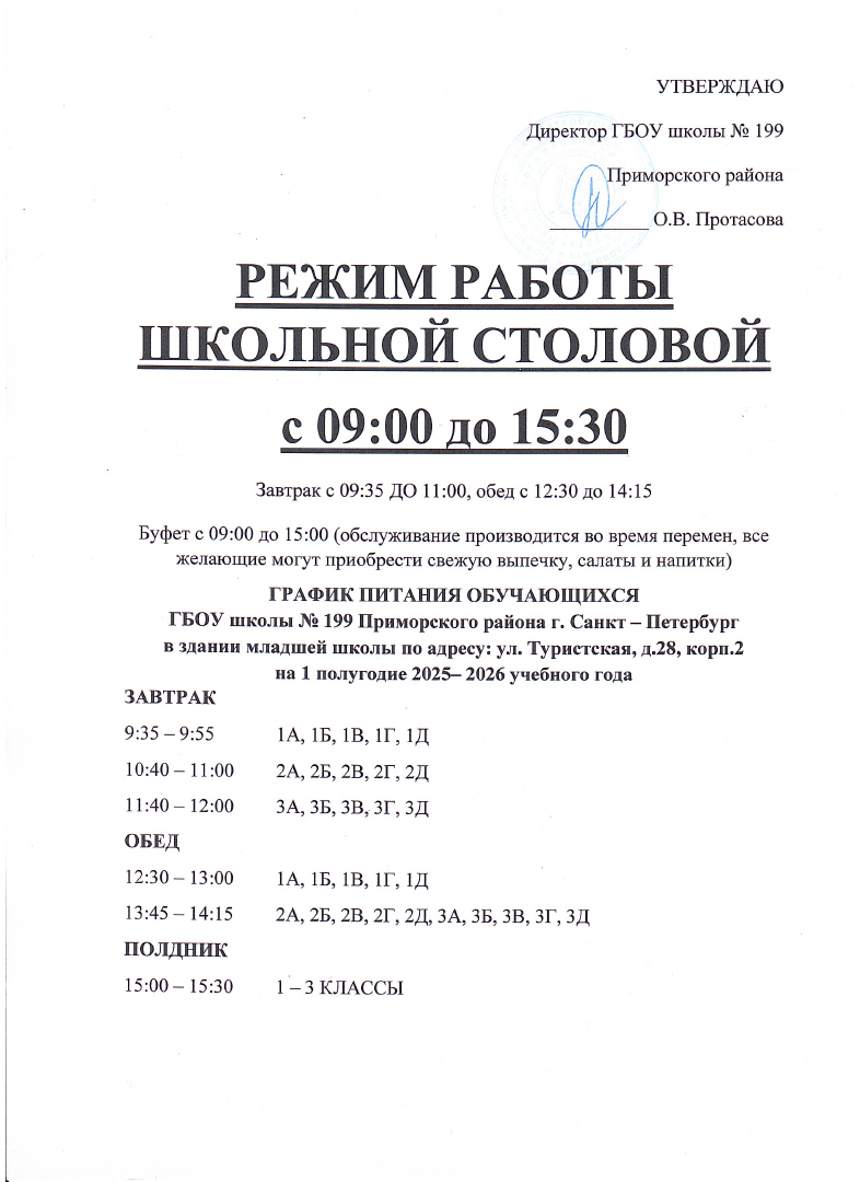 - Завтрак: с 09:40 до 12:05, обед с 12:35 до 15:00, буфет: с 09:00 до 15:30, полдник: с 15:00 до 15:30