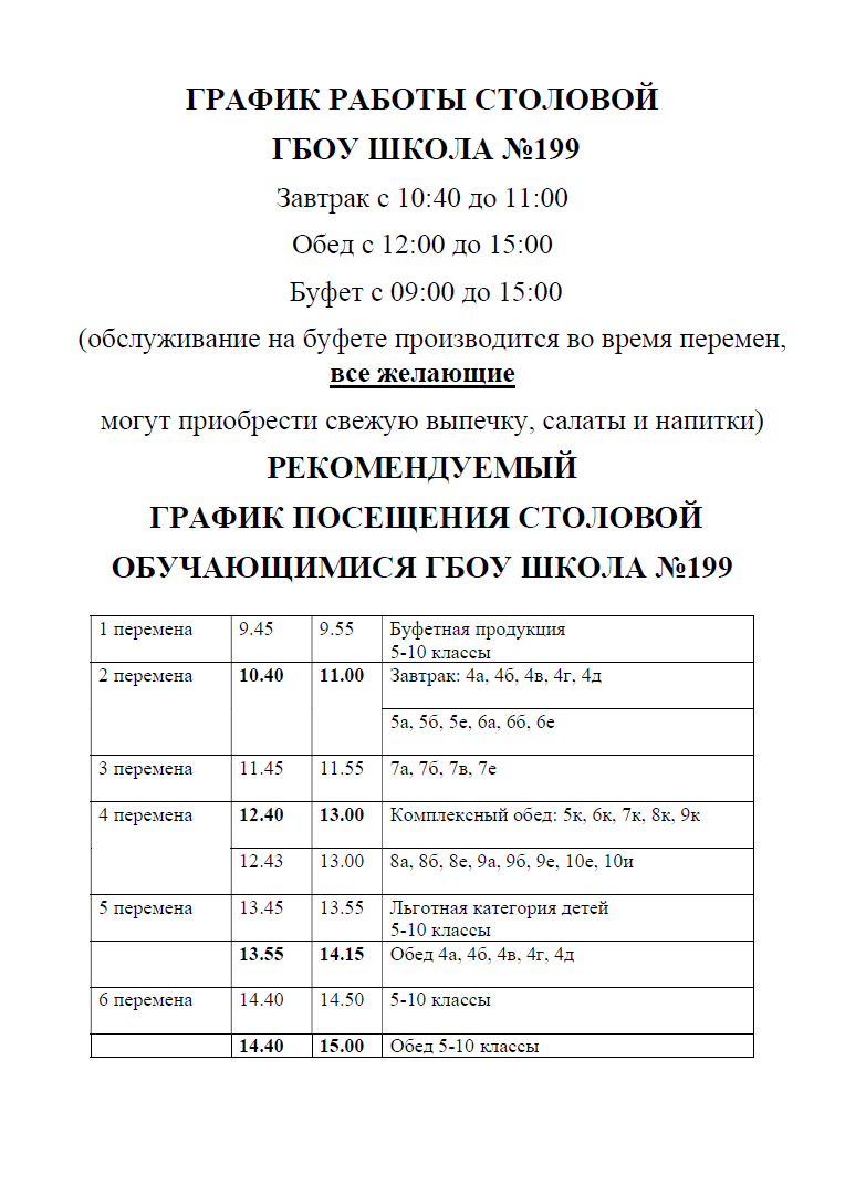 - Завтрак: с 10:40 до 11:00, обед с 12:35 до 15:00, буфет: с 09:00 до 15:00