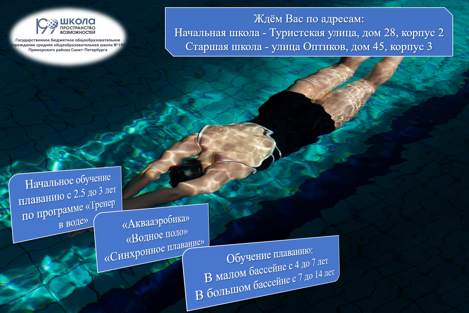 Расписание и стоимость платных услуг в бассейне школы № 199 (Зачеркнутые группы - заполнены!):